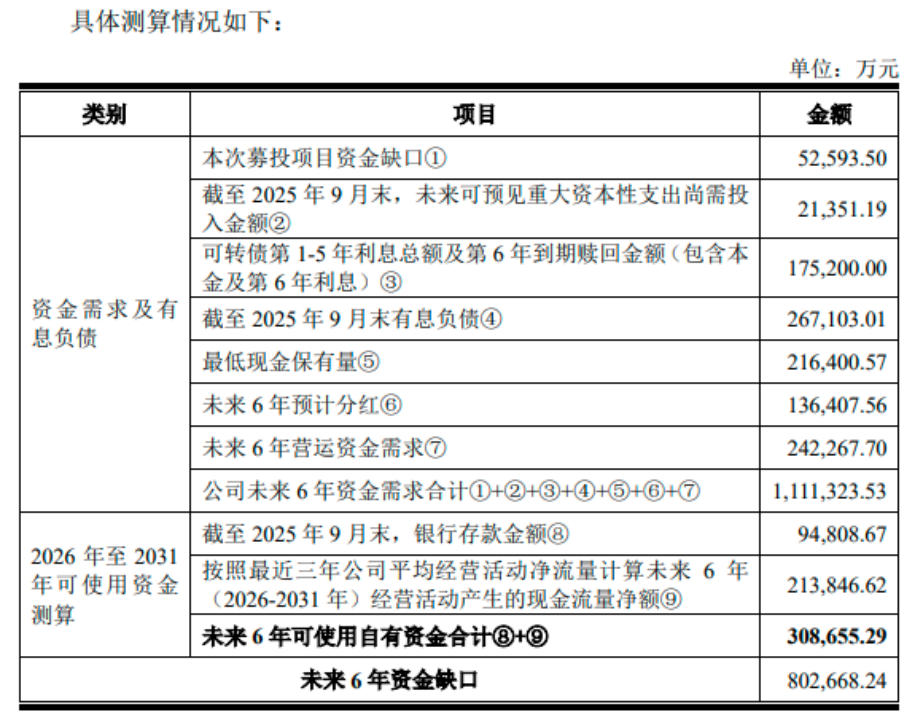 以上各项累加,公司测算未来6年的资金总需求高达111.13亿元。而公司可动用的自有资金,包括现有货币资金和未来6年预计的经营净流入,合计仅为30.87亿元。由此得出,资金缺口高达80.27亿元。此次15亿元的可转债发行,尚不足以填补这一巨大缺口的五分之一。